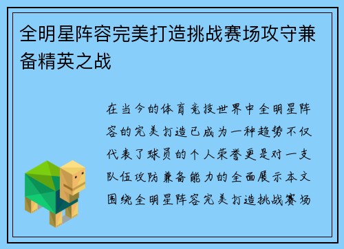 在当今的体育竞技世界中,全明星阵容的完美打造已成为一种趋势,不仅代表了球员的个人荣誉,更是对一支队伍攻防兼备能力的全面展示。本文围绕“全明星阵容完美打造挑战赛场攻守兼备精英之战”为中心展开,深入探讨了...
