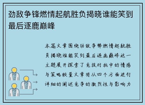 本篇文章围绕“劲敌争锋燃情起航胜负揭晓谁能笑到最后逐鹿巅峰”这一主题展开,探索了竞技对抗中的情感与策略较量。文章将从四个方面进行详细的阐述:竞争的激烈性与影响力、胜负背后的心理博弈、逐鹿巅峰的战术布局...