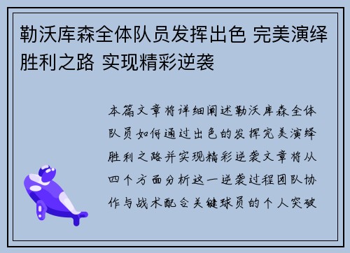 本篇文章将详细阐述勒沃库森全体队员如何通过出色的发挥,完美演绎胜利之路,并实现精彩逆袭。文章将从四个方面分析这一逆袭过程:团队协作与战术配合、关键球员的个人突破、心理素质的稳固表现,以及球队的坚韧不拔...
