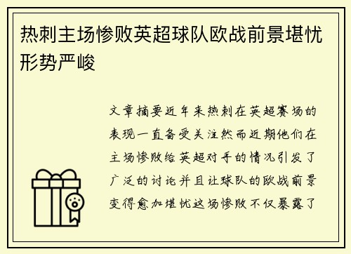 文章摘要:近年来,热刺在英超赛场的表现一直备受关注。然而,近期他们在主场惨败给英超对手的情况引发了广泛的讨论,并且让球队的欧战前景变得愈加堪忧。这场惨败不仅暴露了热刺在战术上的漏洞,还让球队在人员配置...
