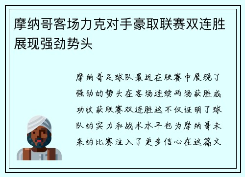 摩纳哥足球队最近在联赛中展现了强劲的势头,在客场连续两场获胜,成功收获联赛双连胜。这不仅证明了球队的实力和战术水平,也为摩纳哥未来的比赛注入了更多信心。在这篇文章中,我们将从多个方面分析摩纳哥客场力克...