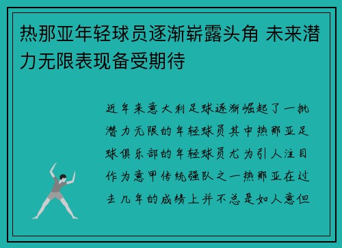 近年来,意大利足球逐渐崛起了一批潜力无限的年轻球员,其中热那亚足球俱乐部的年轻球员尤为引人注目。作为意甲传统强队之一,热那亚在过去几年的成绩上并不总是如人意,但其培养出的年轻球员却逐渐崭露头角,展现出...
