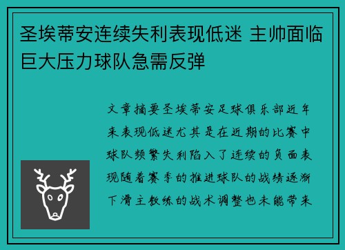 文章摘要:圣埃蒂安足球俱乐部近年来表现低迷,尤其是在近期的比赛中,球队频繁失利,陷入了连续的负面表现。随着赛季的推进,球队的战绩逐渐下滑,主教练的战术调整也未能带来预期的效果,导致球队的士气和信心严重...