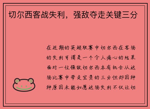 在近期的英超联赛中,切尔西在客场的失利可谓是一个令人痛心的结果。面对一位强敌,切尔西本有机会从这场比赛中带走宝贵的三分,但却因种种原因未能如愿。这场失利不仅让切尔西错失了登上更高位置的机会,还在积分榜...