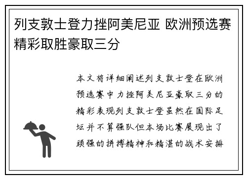 本文将详细阐述列支敦士登在欧洲预选赛中力挫阿美尼亚,豪取三分的精彩表现。列支敦士登虽然在国际足坛并不算强队,但本场比赛展现出了顽强的拼搏精神和精湛的战术安排,最终以一场震撼全场的胜利战胜阿美尼亚,为自...