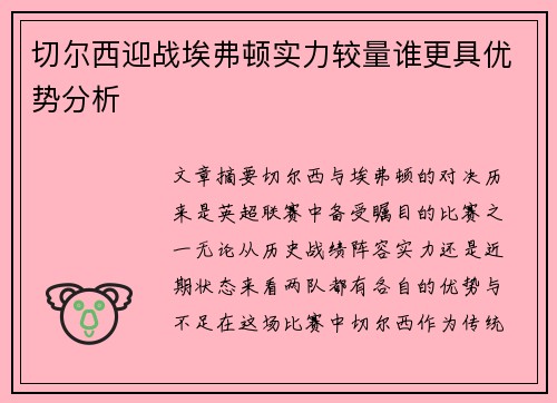 文章摘要:切尔西与埃弗顿的对决,历来是英超联赛中备受瞩目的比赛之一。无论从历史战绩、阵容实力还是近期状态来看,两队都有各自的优势与不足。在这场比赛中,切尔西作为传统强队,常常占据更多的关注,而埃弗顿虽...
