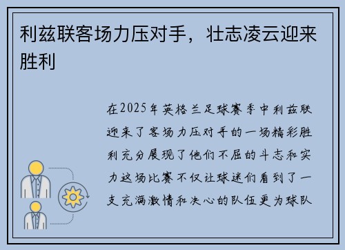 在2025年英格兰足球赛季中,利兹联迎来了客场力压对手的一场精彩胜利,充分展现了他们不屈的斗志和实力。这场比赛不仅让球迷们看到了一支充满激情和决心的队伍,更为球队的未来注入了信心。通过顽强拼搏,利兹联...
