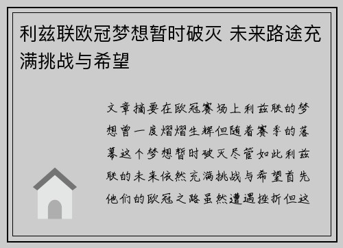 文章摘要:在欧冠赛场上,利兹联的梦想曾一度熠熠生辉,但随着赛季的落幕,这个梦想暂时破灭。尽管如此,利兹联的未来依然充满挑战与希望。首先,他们的欧冠之路虽然遭遇挫折,但这也激励着球队不断提升和完善自我。...