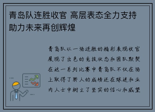 青岛队以一场连胜的精彩表现收官,展现了出色的竞技状态和团队默契。在这一系列比赛中,青岛队不仅在场上取得了骄人的成绩,还在球迷和业内人士中树立了坚实的信心和威望。与此同时,青岛队高层的表态也为未来的发展...