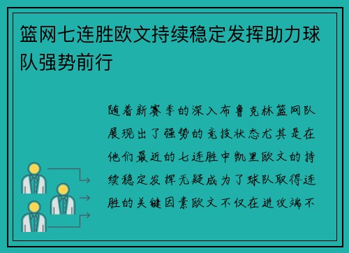 随着新赛季的深入,布鲁克林篮网队展现出了强势的竞技状态,尤其是在他们最近的七连胜中,凯里·欧文的持续稳定发挥无疑成为了球队取得连胜的关键因素。欧文不仅在进攻端不断为球队提供火力支持,更在防守和组织方面...