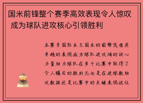 本赛季,国际米兰(国米)的前锋凭借其卓越的表现,成为球队进攻端的核心力量,助力球队在多个比赛中取得了令人瞩目的胜利。无论是在进球数、助攻数据还是比赛中的关键表现,这位前锋都展现了极高的竞技水平,成为了...