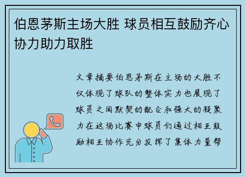 文章摘要:伯恩茅斯在主场的大胜,不仅体现了球队的整体实力,也展现了球员之间默契的配合和强大的凝聚力。在这场比赛中,球员们通过相互鼓励、相互协作,充分发挥了集体力量,帮助球队取得了一场意义非凡的胜利。首...