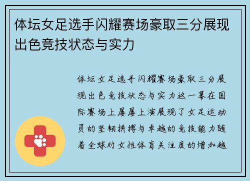 体坛女足选手闪耀赛场豪取三分,展现出色竞技状态与实力。这一幕在国际赛场上屡屡上演,展现了女足运动员的坚韧、拼搏与卓越的竞技能力。随着全球对女性体育关注度的增加,越来越多的女足选手以其不屈不挠的精神和出...