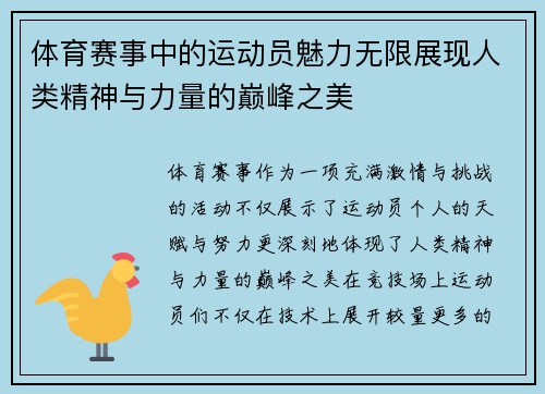 体育赛事作为一项充满激情与挑战的活动,不仅展示了运动员个人的天赋与努力,更深刻地体现了人类精神与力量的巅峰之美。在竞技场上,运动员们不仅在技术上展开较量,更多的是在心理、体能和意志力的角逐中彰显出人类...