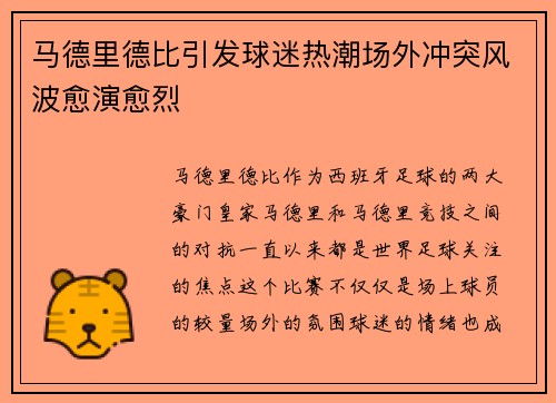 马德里德比作为西班牙足球的两大豪门——皇家马德里和马德里竞技之间的对抗,一直以来都是世界足球关注的焦点。这个比赛不仅仅是场上球员的较量,场外的氛围、球迷的情绪也成为了焦点之一。近年来,随着马德里德比的...