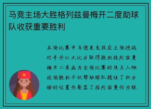 本场比赛中,马德里竞技在主场迎战对手并以大比分取得胜利,格列兹曼梅开二度,成为全场比赛的焦点人物。这场胜利不仅帮助球队稳住了积分榜的位置,也彰显了格列兹曼作为球队核心的巨大作用。接下来,本文将从四个方...