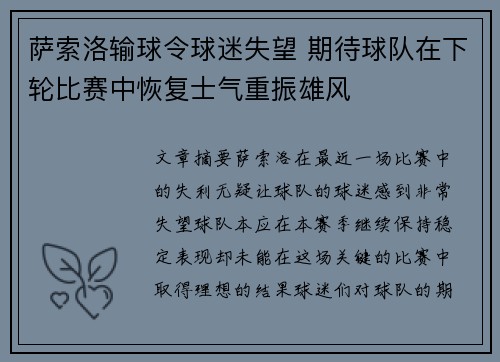 文章摘要:萨索洛在最近一场比赛中的失利无疑让球队的球迷感到非常失望,球队本应在本赛季继续保持稳定表现,却未能在这场关键的比赛中取得理想的结果。球迷们对球队的期望值很高,但看到球队的低迷状态,他们开始对...