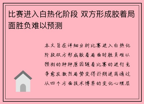 本文旨在详细分析比赛进入白热化阶段,双方形成胶着局面时,胜负难以预测的种种原因。随着比赛的进行,竞争愈发激烈,局势变得扑朔迷离。通过从四个方面——技术博弈的变化、心理层面的较量、战术部署的调整、现场氛...