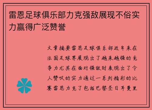 文章摘要:雷恩足球俱乐部近年来在法国足球界展现出了越来越强的竞争力,尤其在面对强敌时,表现出了令人赞叹的实力。通过一系列精彩的比赛,雷恩力克了包括巴黎圣日耳曼、里昂等顶级俱乐部,凭借强大的阵容和战术布...