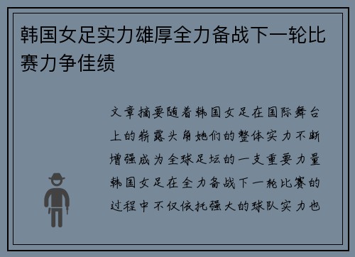 文章摘要:随着韩国女足在国际舞台上的崭露头角,她们的整体实力不断增强,成为全球足坛的一支重要力量。韩国女足在全力备战下一轮比赛的过程中,不仅依托强大的球队实力,也借助高效的战术部署、科学的训练体系和丰...