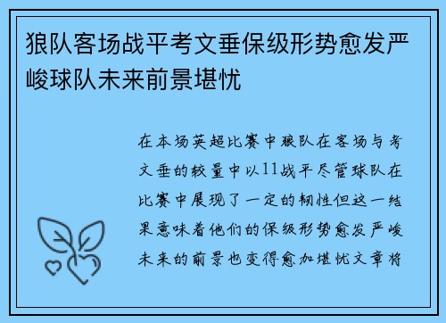 在本场英超比赛中,狼队在客场与考文垂的较量中以1-1战平。尽管球队在比赛中展现了一定的韧性,但这一结果意味着他们的保级形势愈发严峻,未来的前景也变得愈加堪忧。文章将从四个方面详细分析狼队目前的困境:1...