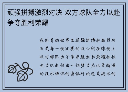 在体育的世界里,顽强拼搏和激烈对决是每一场比赛的核心所在。球场上,双方球队为了争夺胜利和荣耀,往往全力以赴,付出一切努力。无论是精湛的技术、强悍的身体对抗,还是战术的博弈,每一位球员都在为自己所在的团...