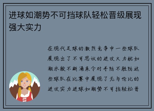在现代足球的激烈竞争中,一些球队展现出了不可思议的进攻火力,犹如潮水般不断涌来,令对手防不胜防。这些球队在比赛中展现了无与伦比的进攻实力,进球如潮,势不可挡,轻松晋级各项赛事,并在过程中展现了他们强大...